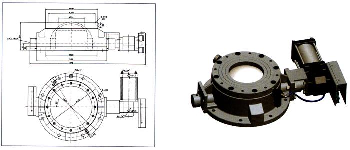 如附图1所示:圆顶阀阀芯是一个球面圆顶,圆顶阀在开关过程中,阀芯与橡胶密封圈间保持有约0.2~0.4mm的间隙,使阀芯与橡胶密封圈可以以无接触的方式运动,目的是使阀芯与橡胶密封圈之间不产生摩擦,减少磨损。圆顶阀的气动执行元件为双作用直线气缸,通过转臂驱动圆顶阀阀芯转动。当圆顶阀处于关闭状态时,橡胶密封圈充气,膨胀紧紧地压在球面圆顶阀芯上,从而形成一个非常可靠密封环带,组织了管道内物料的流动。